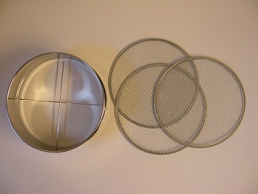 Handsåll x 3. Sållet har 3 stycken utbytbara maskstorlekar 2,5 mm, 5 mm och 8 mm. Mått på såll: 39 cm i diameter och 6,5 cm högt. (570,00 kr exkl.moms)